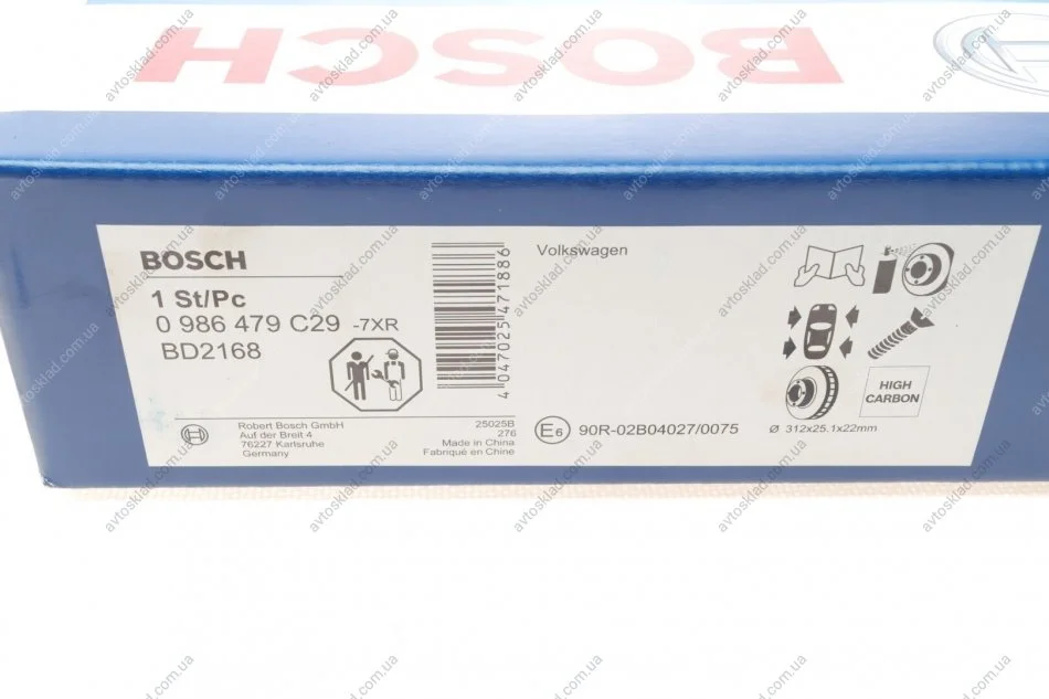 Тормозной диск перед. AUDI A3 03- VW Golf V, Passat 05- SKODA (312*25) BOSCH 0986479C29