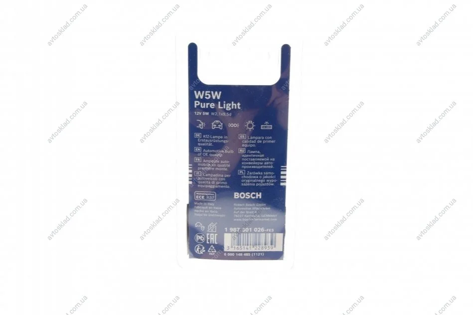 Лампа 12V 5W W5W W2,1x9,5d PURE LIGHT 2шт blister BOSCH 1987301026