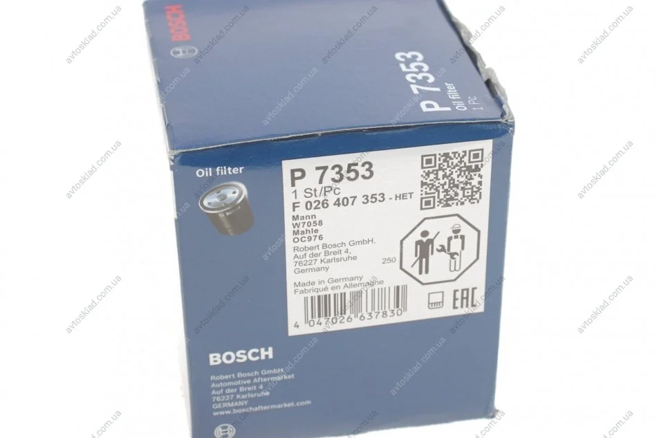 Фильтр масляный CITROEN BERLINGO, PEUGEOT PARTNER 96-, FIAT DUCATO, SCUDO 06- BOSCH F 026 407 353