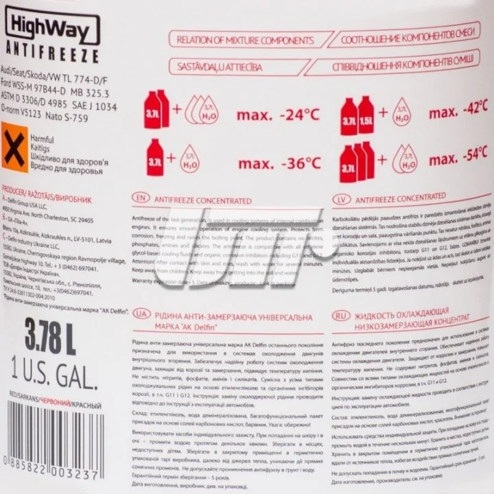 Антифриз-концентрат, G12+ (красный), 3.78л HighWay 701492