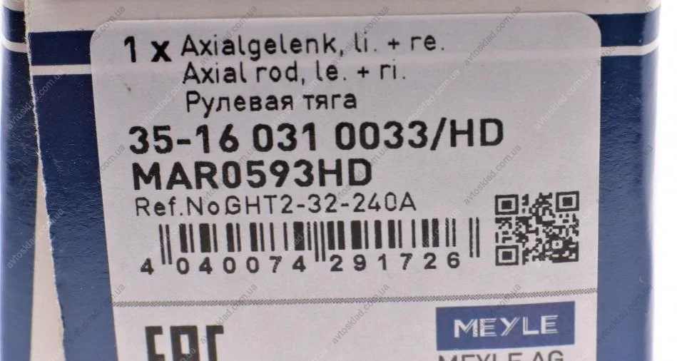 Осевой шарнир, рулевая тяга прав/лев MEYLE 35160310033HD