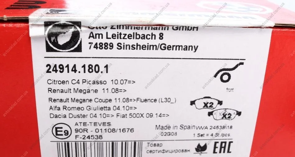 Колодки тормозн. передн. DACIA DOKKER, DUSTER, LODGY; RENAULT FLUENCE ZIMMERMANN 24914.180.1