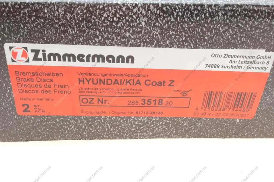 Тормозной диск перед вент Hyundai Sonata NF/Tucso ZIMMERMANN 285351820