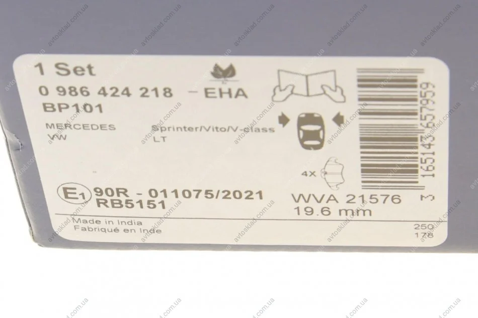 Колодка гальм. диск. MB SPRINTER 2-t, VW LT 28-35 передн. BOSCH 0986424218
