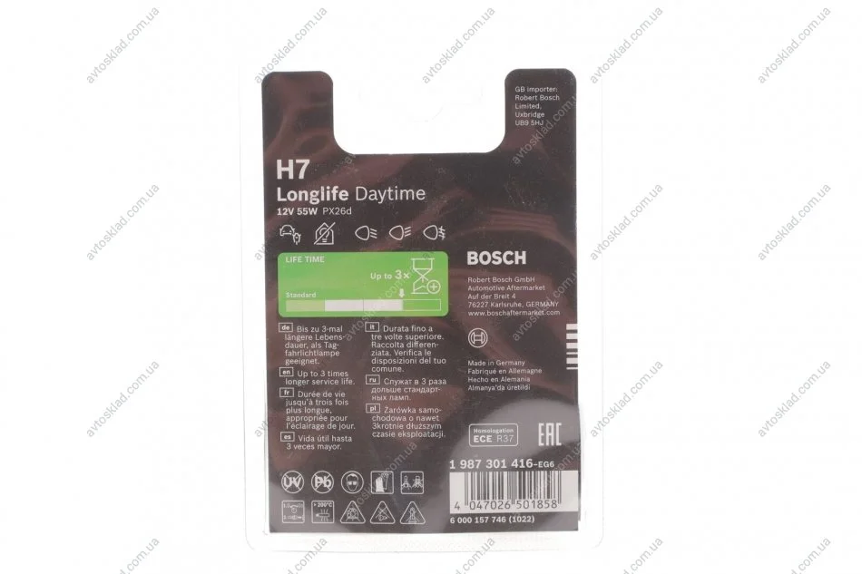 Лампа розжарювання H7 12V 55W PX26d Longlife Daytime (компл. 2шт) BOSCH 1987301416