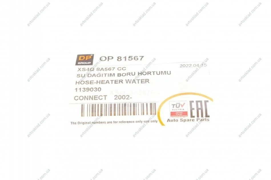 Патрубок радіатора пічки Ford Connect 1.8Di/TDCi 02- DP GROUP OP81567