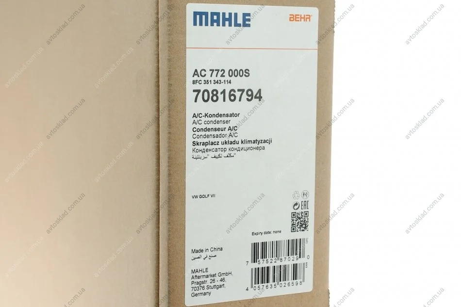 Радіатор кондиціонера MAHLE / KNECHT AC 772 000S